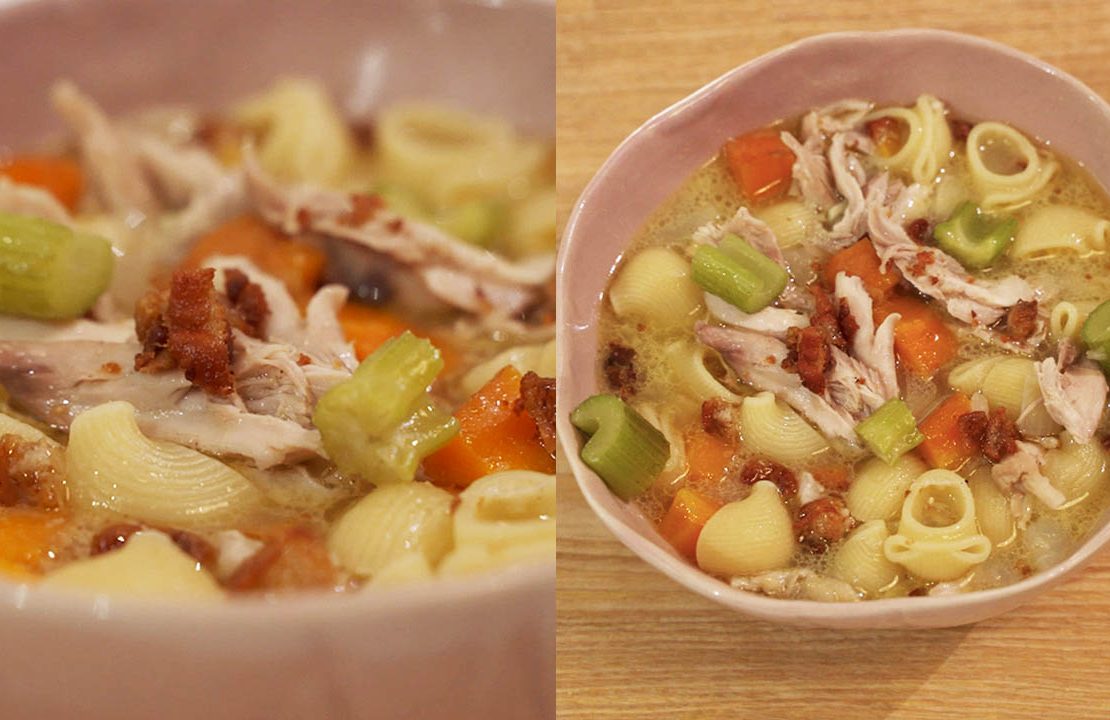 “My chicken noodle soup [is] equal parts chicken, pasta, veggies and soup—deliciousness! Eat it on a hot day, on an airconditioned day. Best served with your favorite childhood drink,” says Coco.