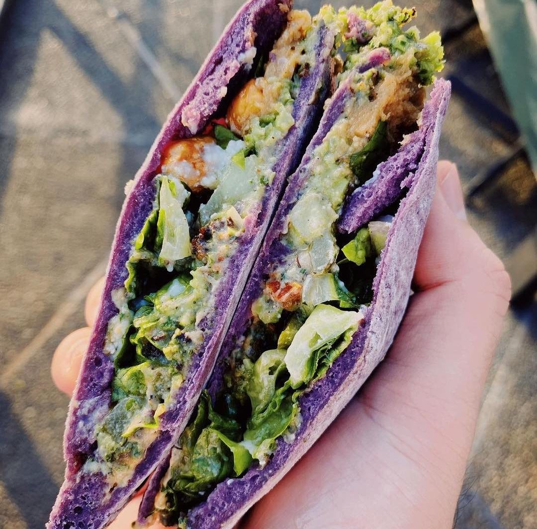 My curiosity got the best of me, though. I took the plunge and ordered a No. 5, which is the ube pita filled with edamame falafel, black garlic tahini, “bananaganoush,” and ricotta with a side of kamote fries.