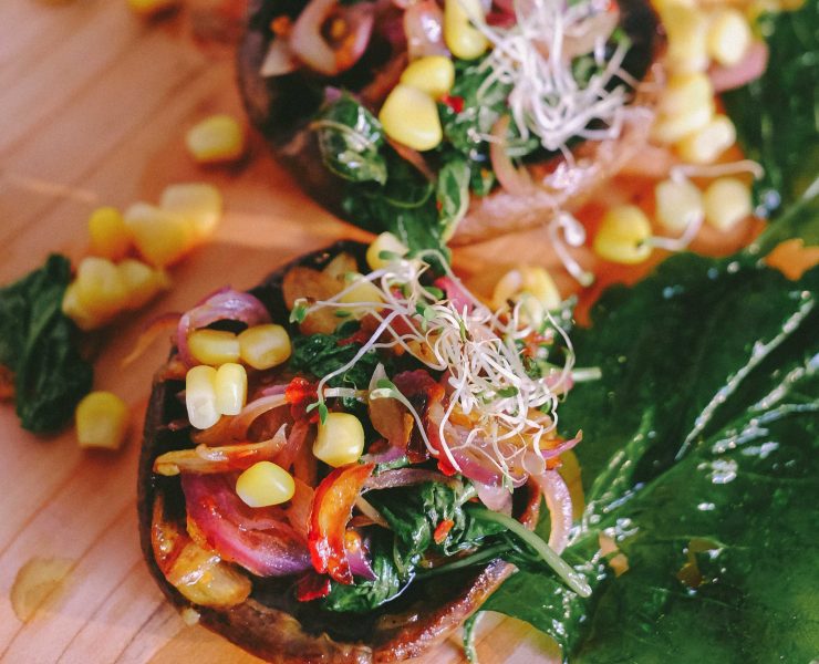 Roasted portobello mushrooms with spinach, sweet corn, and red onions